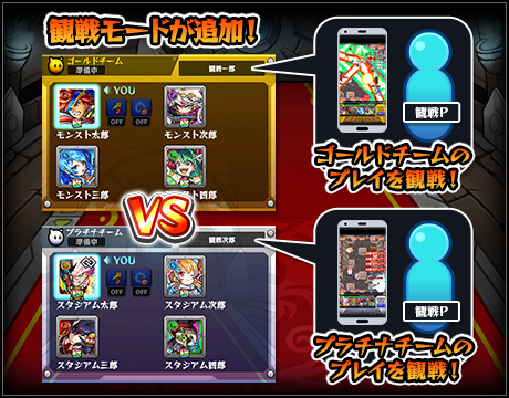 観戦モードでは、オフライン・オンライン大会いずれにおいてもプレイ配信を実施しやすくなるように、各チームにつき新たに1端末が観戦者としてクエストに参加できるようになります。