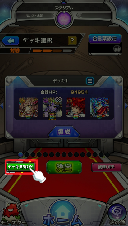 ①ステージを選び、デッキ選択画面の「デッキ共有ON」ボタンを押す。![]()