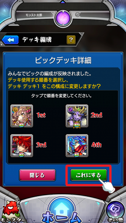 ・ピックデッキの詳細が表示されるので、使用するキャラクターを順番にタップし「これにする」ボタンを押す。![]()