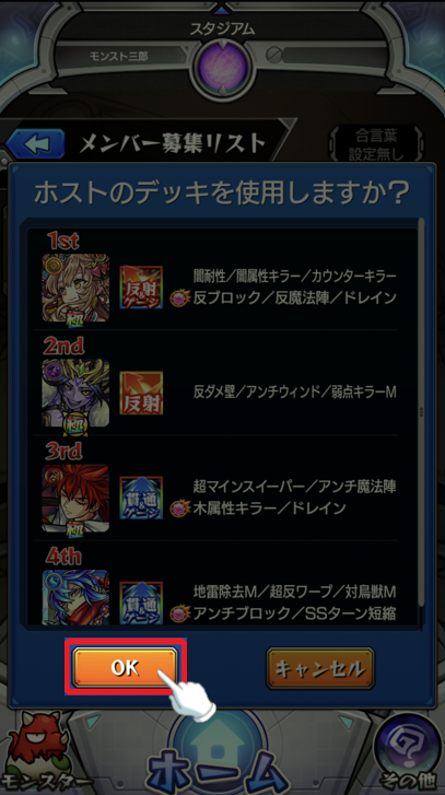 ①ステージとデッキを選び、メンバー募集リストの「共有ON」になっているホストを選ぶ。![]()